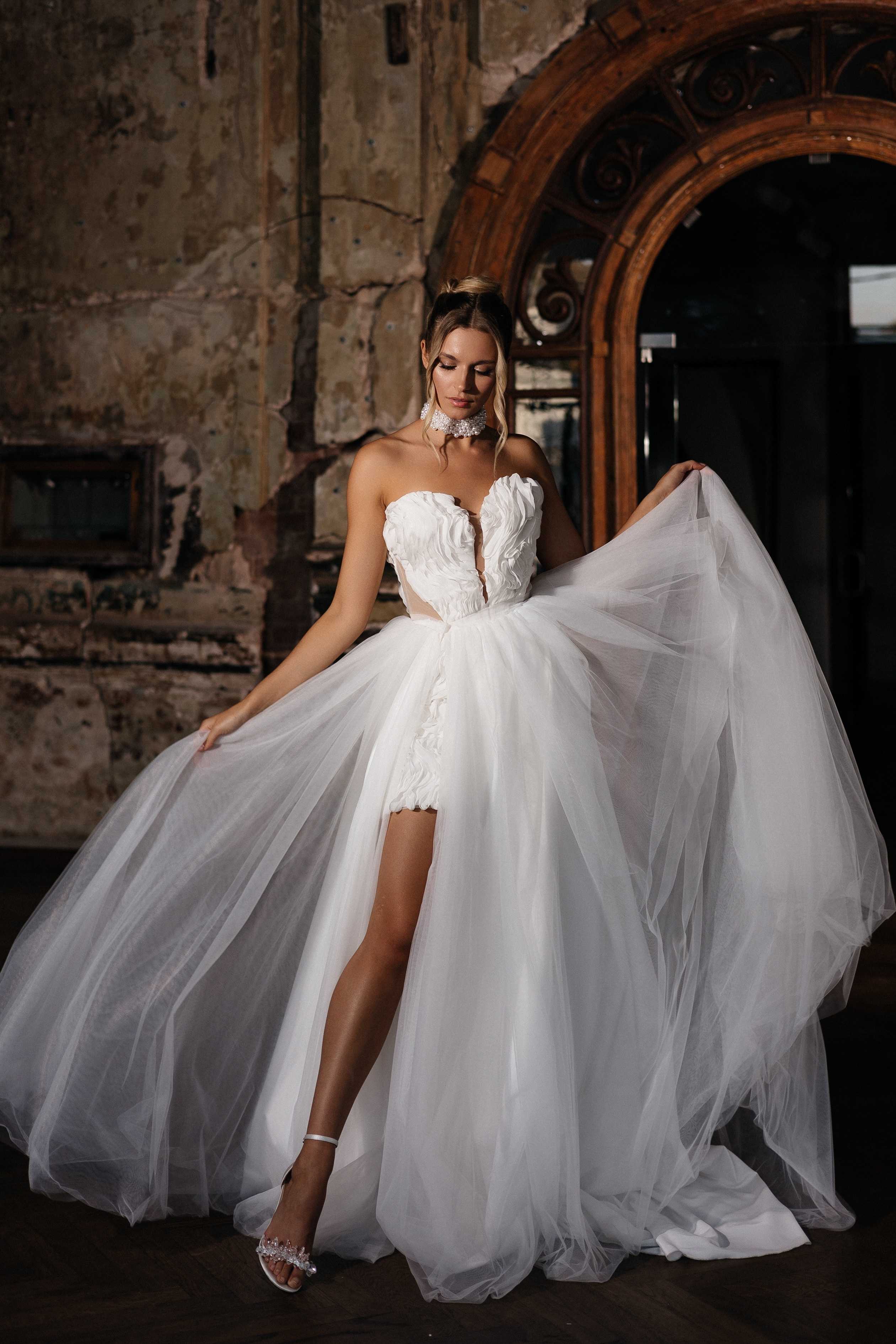 Свадебное платье в длине мини. Юбка съемная приобретается отдельно. Стоимость юбки 10.500₽ ...